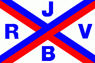 The flag was white parted by a blue over red bend, superimposed by a blue over red bend siniste with additional blue initials on every quarter as follows: "J"(top), "R"(hoist), "V"(fly) and "B"(bottom).