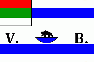 The white flag was parted by two blue horizontal stripes. On canton was a horizontal tricolour in the colours of Anhalt, red-white-green. Upon the lower green stripe was a black bear passing on a blue section of a circle, flanked by dotted black initials "V." and "B.".
