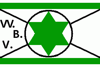 The white flag was parted by two green horizontal stripes. The field between the stripes was parted by a thin black saltire, on centre superimposed by a black circle charged with a green 6-point star. On hoist was a black inscription in triangle "W.V.B.".