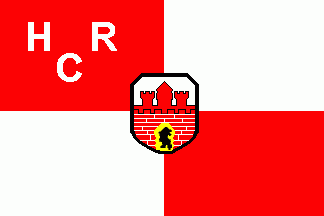 The flag was quartered of red and white with centred city arms of Harburg. On upper hoist quarter was a white inscription "HR" over "C".