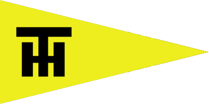 The first pennant (see left image above) is yellow with a black ancient ship heading to fly on a blue wave. On the main sail is a black logo "HT" The 2nd pennant (see right image above) is also yellow displaying just the logo in black. The "T" of the logo is longer and flanked by the "h"