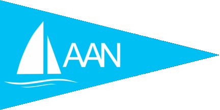 The pennant is light blue. On hoist is a white sailing boat on a white wave. On centre is a white inscription "AAN".
