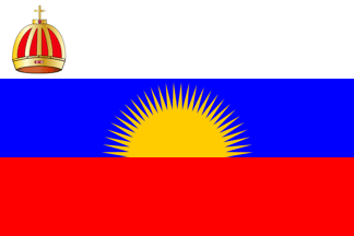 The presidency was on a rotating basis, and in 1867 the chief of Lakemba would become president. This was Ma'aufu, a Tongan who remained loyal to the Tonga king. The other chiefs protested, and Cakobau together with the other chiefs of the island Viti-Levu [Great Fiji] founded a new alliance with the name: Kingdom of Bau. Cakobau was proclaimed king of Bau 2nd May 1867. The flag according to R.A. Derrick was blue with half sun in the bottom (30 rays) and the royal crown in the upper hoist (the crown image in Vexilla Nostra is very unclear). Ma'aufu was still governor of Lau and Vanua-Levu (as vassal of the King of Tonga), which was known as the Alliance of North and East Fiji and used no flag.