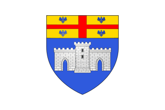 Azure, a castle argent pierced and masoned sable extended by walls argent masoned sable, open of the field, and on a chief Or, a cross gules between 4 alerions azure.