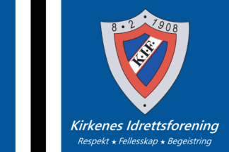 The flag of Kirkenes IF (Kirkenes Idrettsforening) from Kirkenes in Sør-Varanger Municipality is blue with three white, black, white stripes near the hoist and the badge centered in the larger blue field toward the fly.
