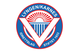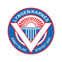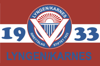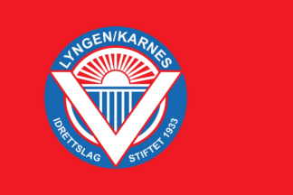 The flags of Lyngen/Karnes IL (Lyngen/Karnes Idrettslag) from Lyngseidet in Lyngen Municipality use the badge on white or red backgrounds. A variant has a maroon-white-maroon horizontal triband with the date 19-33 on either side of the badge.