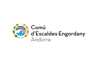 At the official website (image here), the parochial emblem is a seal-like logo. The seal shows the local stone bridge and mineral spring fountain (canting for "les Escaldes," "the boiling [ones/waters]"), stylized, within a wreath of two different branches (laurel and wheat?) This on a white circular background and around it the lettering "Comú d'Escaldes-Engordany" above and "Andorra" below, separated by dots and set in black sans-serif capitals.