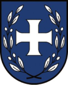 The coat of arms is shield-shaped, with a white (=silver) cross pattée (four equal arms) in the centre on a blue background (symbolising the lake), accompanied by two crossed laurel branches with fruit (also white). The originally awarded coat of arms had a red background, with the cross and laurel in yellow.