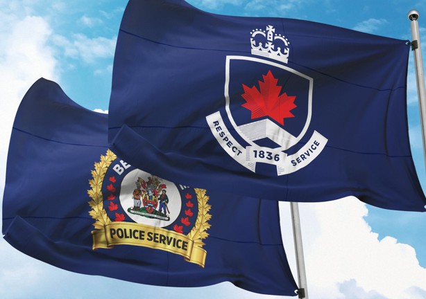 The City of Belleville, Ontario, has its own Belleville Police Service. It has two flags - both are blue, one with the crest (badge), the other with the logo on it.