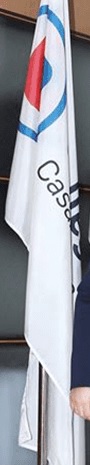 The flag is a white horizontal background featuring the logo towards the hoist plus the host city's name below.