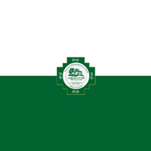 The flag is a square background with two colors, white (top) and green (bottom) with the logo in the middle, the logo being a representation of a cross silhouette in green and black, with a slogan