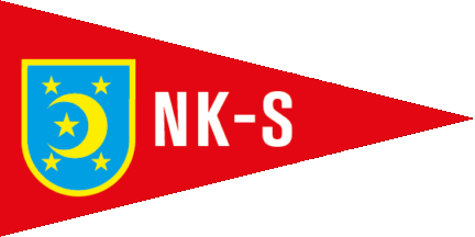 The pennant is red. At hoist are the city arms of Nykøbing, shield Azure a waxing crescent Or between two 5-point stars of the same in quincunx. Shifted to fly is a white inscription "NK-S".