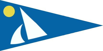 The pennant is blue. At hoist are various white sails over white waves, partially surrounded by a white circle.