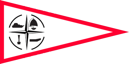 At hoist is a black logo displaying a 4-point Star (compass rose) flanked by a mtor baot, a sailing boat, a buoy and a rudder, all in an interrupted annulet.