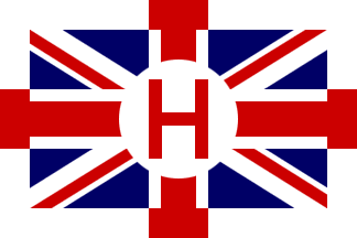 A postcard collection [o9oXXb] shows this flag without the red "H" on a white disc, consisting only of the two overlapped flags. It shows their relative proportions in such a way that the overall flag is 2:3, the “border” (i.e., the visible portion of the Saint George flag all around the Union Jack) width is 1/8th of the flag’s height (and therefore the U.J. itself is 3:5), and both the width of the white crossarms of the U.J. and of the red crossarms of the St.G. are 1/4th of the flag’s height, all of which yields a pleasant pattern other illustrations do not. This is my interpretation of the postcard image, of course: It’s not detailed enough to fully match this exact geometry, especially at the upper fly quadrant, and the naturalistic fluttering depiction doesn’t help.