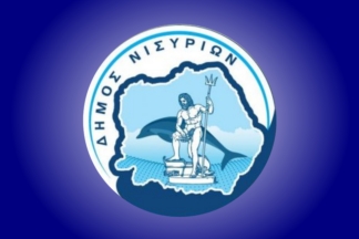 The flag of Nisyros is deep blue fading to a lighter blue in the center with the seal featuring Poseidon and a leaping dophin on a map of the island.