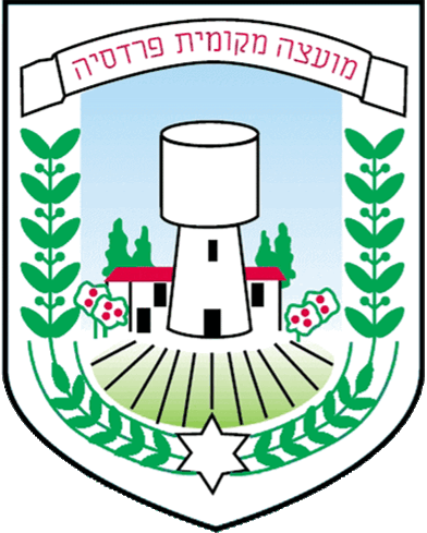 Keywords: pardesiyya | mo'atza mekomit pardesiyya | text: hebrew (white) | text: hebrew (black) | coat of arms (water tower) |