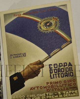 Picture caption reads: "Coppa d'oro del littorio. mano virile in camicia nera sventola una bandiera blu con fascia tricolore e stemma del Reale Automobile Club d'Italia al centro" (Golden Cup of the Littorio. A man's hand in a black shirt waves a blue flag with a tricolor band and the emblem of the Royal Automobile Club of Italy in the center). This advertisement poster features a flag for the "Golden Cup" a non-championship competition that wanted to be linked to the more traditional "Giro d'Italia automobilistico". Notice the reference of the "camicia nera" (plural "camicienere") in reference to the "National Fascist Party, Italy", at the time, the country's ruling party, in an event held between May 26 and June 2, 1934 (source: https://thefinitive.com/prodotto/raci-coppa-doro-del-littorio-badge-smaltato) when they were in power.