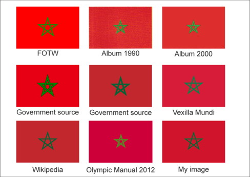 So, while the recommendations within source may not be the official, government, version of each flag, they are certainly what the NOC believed the flag to be. (...) For Morocco the vertical flag is simply the horizontal version in 5:3, shades given as PMS 193 red, 363 green.