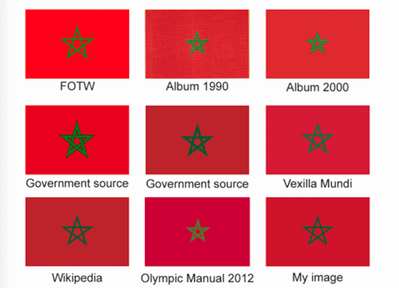 There can be a misunderstanding in case of the Moroccan flag. The translation of the flag law says: "... the emblem of the Kingdom shall be a red flag with a five-pointed green star in the center. The flag shall be made with fabric of bright red, opaque and rectangular in shape." In my term, it says that the flag is red and doesn't give more specific of its shade. The next sentence including the word "bright" only refers to the cloth the flag is made of, but not to the color shade of the national flag. Actually, "bright" is not equal with "light".