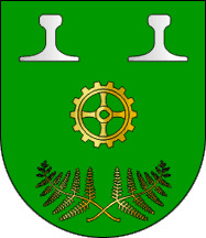 Shield Vert a cogwheel Or between two bunches of grapes Or leafed Argent in chief and two rail profiles Argent in base.