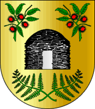 Shield Or a shepherd´s hut Sable masoned and open Argent, two chestnut twigs Vert with burrs cracked Gules on either corner, in base two fern fronds Vert with their proximal stems in saltire.