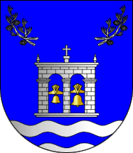 Shield Azure a two-arch belfry Argent with bells Or masoned Sable, flanked at chief by two pine boughs Argent pointing to fess point, on base wavy Argent a bar wavy Azure.