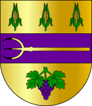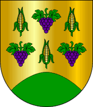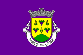 Shield Or three maize ears Or (!) leafed Vert and three grape bunches Purple leafed Vert staggered and arrayed in two fesses, issuant from base a mound Vert. Mural crown Argent with three visible towers (village rank) and white scroll reading in black upper case serifed letters "BARROS - VILA VERDE".