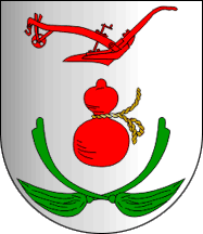 Shield Argent a gourd Gules cordoned Or, in chief a plough Gules, in base two Montpellier brooms Vert arrayed in saltire. Mural crown Argent with three visible towers (village rank) and white scroll reading in black upper case serifed letters "GOMIDE".