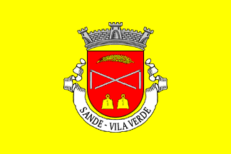 Shield Gules two flails Argent in saltire, in chief a palm frond Or, in base two hoe blades Or in fess. Mural crown Argent with three visible towers (village rank) and white scroll reading in black upper case serifed letters "SANDE - VILA VERDE".