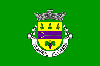 Shield Or on a fess Purple a pitch fork Or, in chief three maize ears Or leafed Vert in pale and arrayed per fess, in base a grape bunch Purple leafed Vert. Mural crown Argent with three visible towers (village rank) and white scroll reading in black upper case serifed letters "VILARINHO - VILA VERDE".