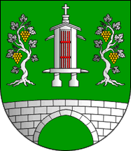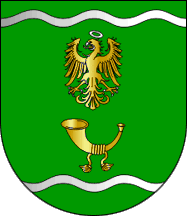 Shield Vert two wheels Argent arrayed in fess with their spokes in fess, in chief a maize ear Or leafed Argent, issuant from base wavy Azure, charged with a bar Argent, a mound Or (see left image above).