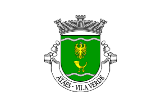 Shield Vert an eagle volant debilitated Or armed Argent with nimbus of the same and a bugle horn Or, both arrayed in pale between two barrulets wavy Argent. Mural crown Argent with three visible towers (village rank) and white scroll reading in black upper case serifed letters "ATÃES - VILA VERDE"".