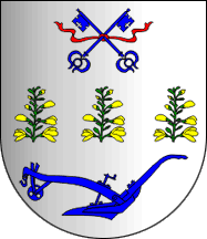 Shield Argent three broom boughs Vert flowered proper and arrayed in fess, in chief two keys Azure with their wards pointing chiefwards arrayed in saltire and tied by a ribbon Gules, in base a plough Azure. Mural crown Argent with three visible towers (village rank) and white scroll reading in black upper case serifed letters "CODECEDA".