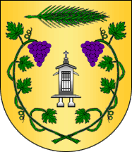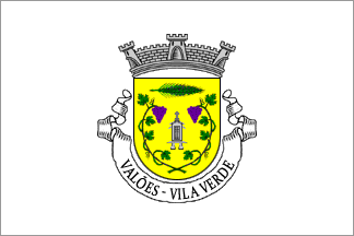 Shield Or a raised granary Argent surrounded at base and flanches by two grapevines Vert fructed Purple in orle and crossed per saltire at base, in chief a palm frond Vert. Mural crown Argent with three visible towers (village rank) and white scroll reading in black upper case serifed letters "VALÕES - VILA VERDE".
