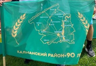 Kalmanskiy County was created in 1935, and in 2025 celebrated its 90th Anniversary. It adopted a flag for this occasion - green with a map of a county two strucks of wheat on each side and text "KALMANSKIY RAYON-90 LET" at the bottom. Photos from the official page of Kalmanskiy County in vkontakte.ru.