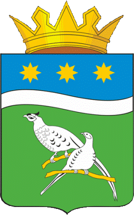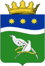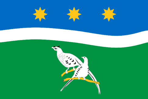 In a green field with a wavy single wave, burdened with three golden stars with eight rays in the belt and bordered with silver, two silver pheasants: a cockerel to the right and a hen to the left, below and above the cockerel directly, turned to the right, sitting on golden abstract branches.