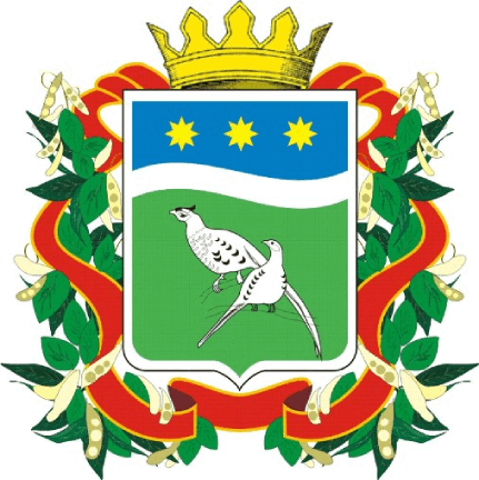 A two-color heraldic shield (in a ratio of 1/3) is divided into two parts by a wavy silver belt (in a ratio of 1/10). The upper part of the shield is azure, the lower is green. On the green field of the shield are two pheasants (a cockerel and a hen). On the blue field are three eight-pointed yellow stars. A silver border runs around the entire shield. The coat of arms is complemented by a golden territorial crown with five visible teeth. The shield is framed with soybean sprigs and encircled by an order ribbon.