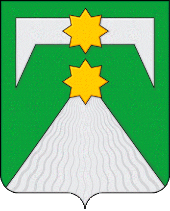 On a green field a silver shortened point, accompanied at the top by a silver bar, the lateral edges of which are extended downwards by wedges, the oblique sides inward; the bar and the top of the point are covered with gold eight-pointed stars.