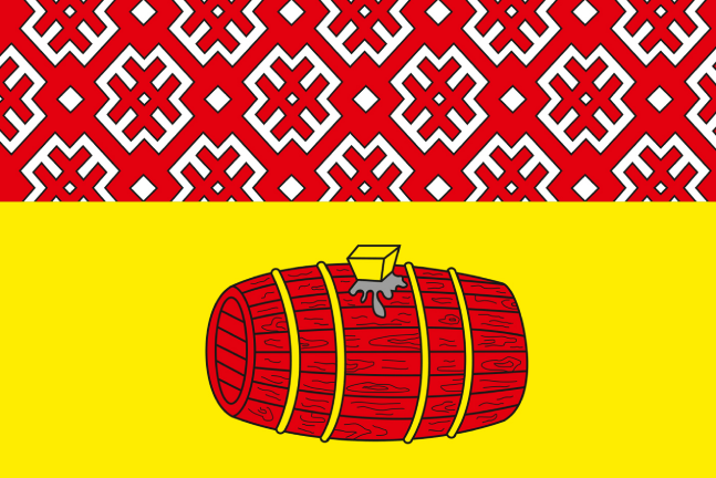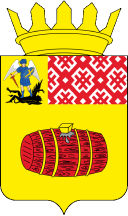 In a gold field, a lying scarlet barrel with gold hoops and black streaks of tar from under the gold bushing. In the silver quarter, a scarlet ornament in the form of an oblique lattice with open rhombuses in knots and double scarlet oblique crosses in the cells. In the free part is the coat of arms of the Arkhangel'skaya region.