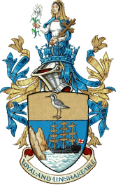 The badge of St. Helena was derived from the Public Seal of the colony; the Royal Arms above an ornamental frame surrounding a picture of a three-masted ship near the base of steep cliffs. Its sails are furled and a flag flies at the stern. As originally drawn, when the badge was introduced in 1874, the flag was a White Ensign, but in later copies the canton was often left blank so that it appeared to be the English flag. It is often assumed that the ship is an East Indiaman, but this was obviously not intended.
