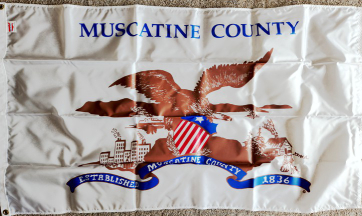 I have found a partial view of the flag for Muscatine County, Iowa. The flag has a white background and consists of a brown eagle(?), a shield of one star and many stripes, and a thin blue ribbon with the words "MUSCATINE COUNTY" in the middle segment and "1836" on the right segment. The left segment is obscured in the picture so I do not know if there is any text. The county seal (it's pretty basic) is also included.