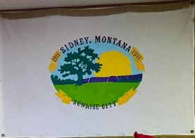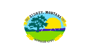 The flag is a white field with a custom emblem in the center. It shows a simplistic scene of the sun rising over the horizon. A tree in the foreground and a few bushes on the sides of the emblem are also present. At the top of the emblem is the city and state names. On either sides are small gold ribbon with the incorporation year printed on the banner. At the bottom of the eblem is the town's nickname "Sunrise City," which is what the sun in the scene represents. On either side of the nickname are the same small banners on either side of the name, only with nothing inscribed on them.