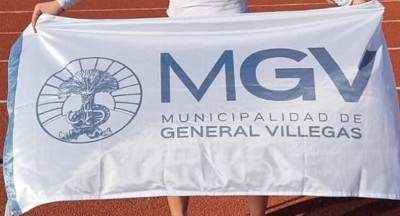 The flag is white with the badge in grey-blue line drawing toward the hoist and the letters MGV above MUNICIPALIDAD DE GENERAL VILLEGAS in blue on two lines.