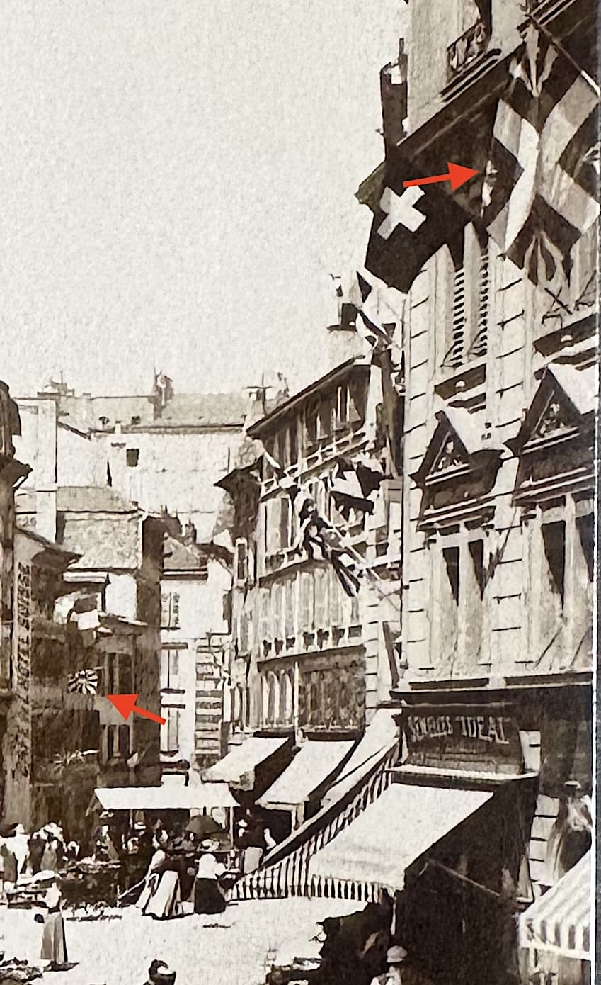At the beginning of the 20th century, flamed flags were still in use, with the white cross replaced by a (baroque) shield in the centre of the flag. These decorative flags had been used until WWII and then somewhat forgotten in preference of the current cantonal flags. Today they are being produced again (see right image).