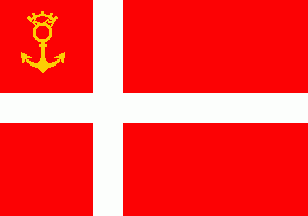 The flag is red parted by an off-centred white cross. In canton is an emblem as follows: A golden anchor topped by an annulet of the same and all surmounted by a "crown" of the same with five embattlements. On 2nd glance you see that the crown consists inwards of the initials "K" and "M" (= Kvindeligt Marinekorps)