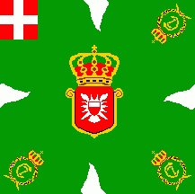 The flag was green with white flames and the arms of the Duchy of Holstein, shield Gules a nettle leaf Argent superimposed by an inescutcheon, parted per fess of Argent and Gules.
