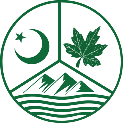 The provincial emblem is circular with green details, divided into three triangular sections. The upper-left section depicts a star and crescent for the national religion; the upper-right section depicts a Chinar leaf, itself a provincial symbol; and the lower section depicts three mountains over four waves for its geography, which includes many waterways.