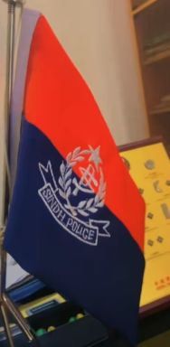 The flag is a horizontal bicolor of red and blue, the typical police service colors. In the center is a simplified logo in white, depicting a wreath of justice surrounding the SP monogram. Just above is a star. Underneath, a ribbon reads SINDH POLICE. The logo used is from https://vectorseek.com/vector_logo/sindh-police