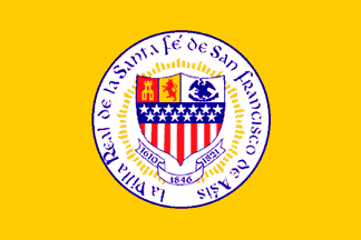 The field of Santa Fe’s flag is yellow with the city’s seal in its center. The seal consists of a narrow blue circle around a white field. Immediately within this circle, running clockwise around the seal from its base is the complete name of the city in Spanish, in a Flat Brush-type font: La Villa Real de la Santa Fé de San Francisco de Asís. Within the circle of lettering is a heraldic “American” shield divided so that the top portion bears on its fly half the principal charge of the arms of Mexico (in a 19th-century version): an eagle with a serpent in its beak perched on a nopal cactus, all in a blue silhouette on white. The hoist half shows a portion of the arms of Spain, a yellow turreted castle in silhouette on a red field on the hoist side, and a silhouetted upright red lion, on the fly side. The lower part of the shield is the modified American blazon, 13 white five-pointed stars (staggered 7 above and 6 below) on dark blue, over 13 vertical stripes (7 red, 6 white). Below the shield is a white heraldic ribbon, edged in blue and folded in thirds. On the three sections appear, in blue: 1610 at the hoist, 1846 in the center, and 1821 at the fly. Emanating from behind the shield in a circle are 85 short gold rays, appearing to be scalloped, since every fifth ray is longer. Several rays are hidden by the shield’s upper corners and the center portion of the heraldic ribbon.